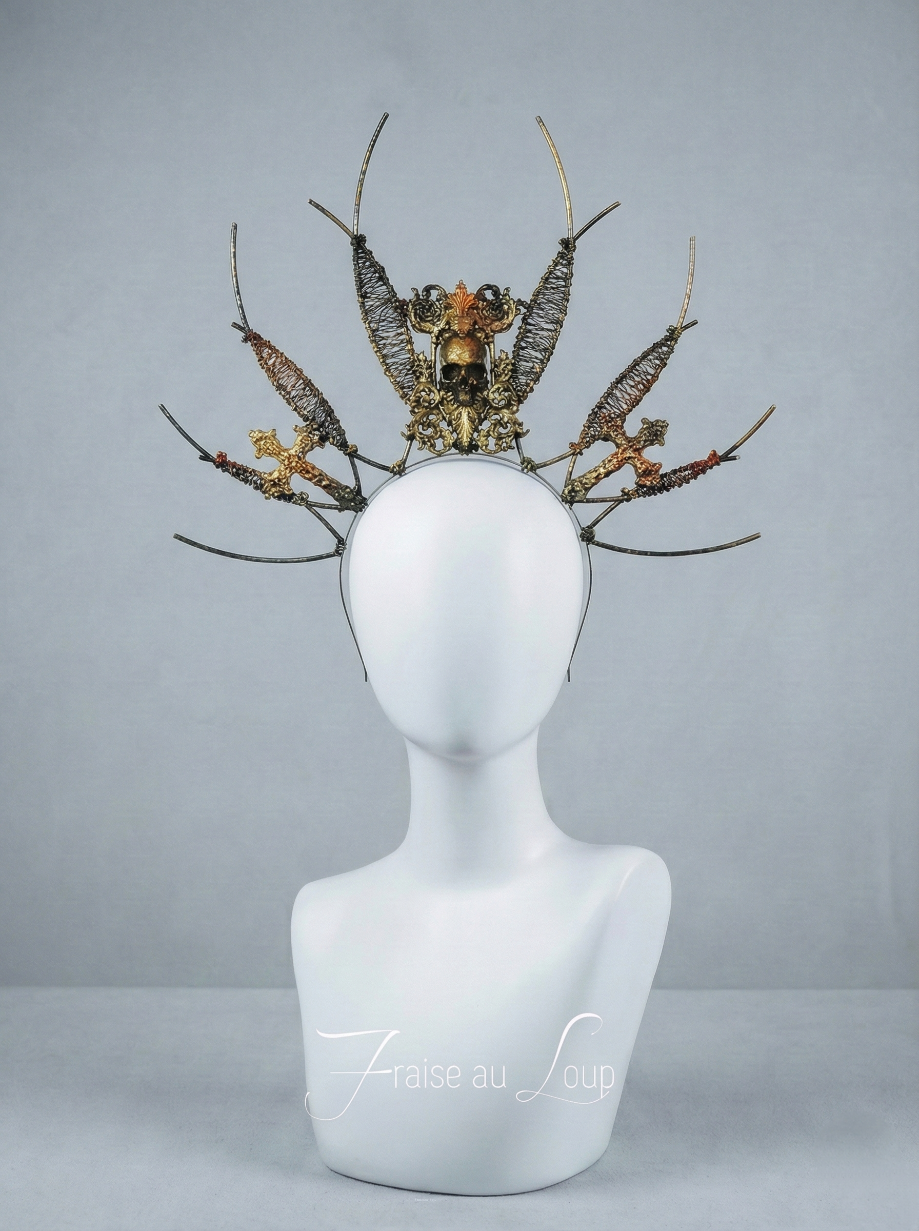 Coiffe halo couronne Céleste, Festival costume, filigranes, diadème, Halloween, tête de mort, gothic headband - Met Gala