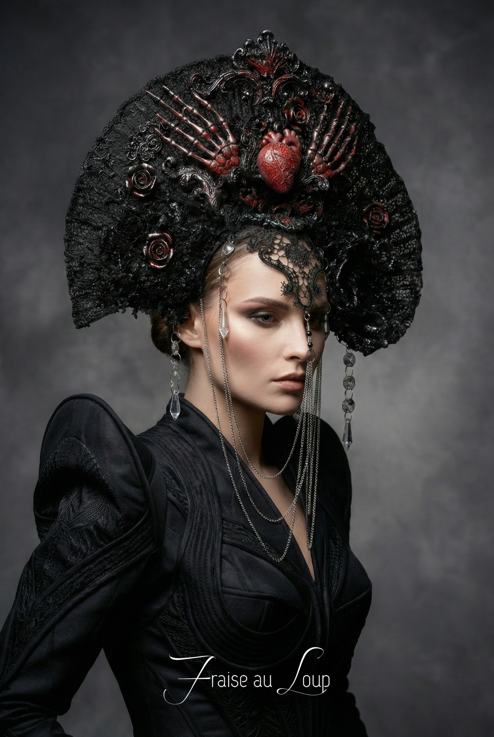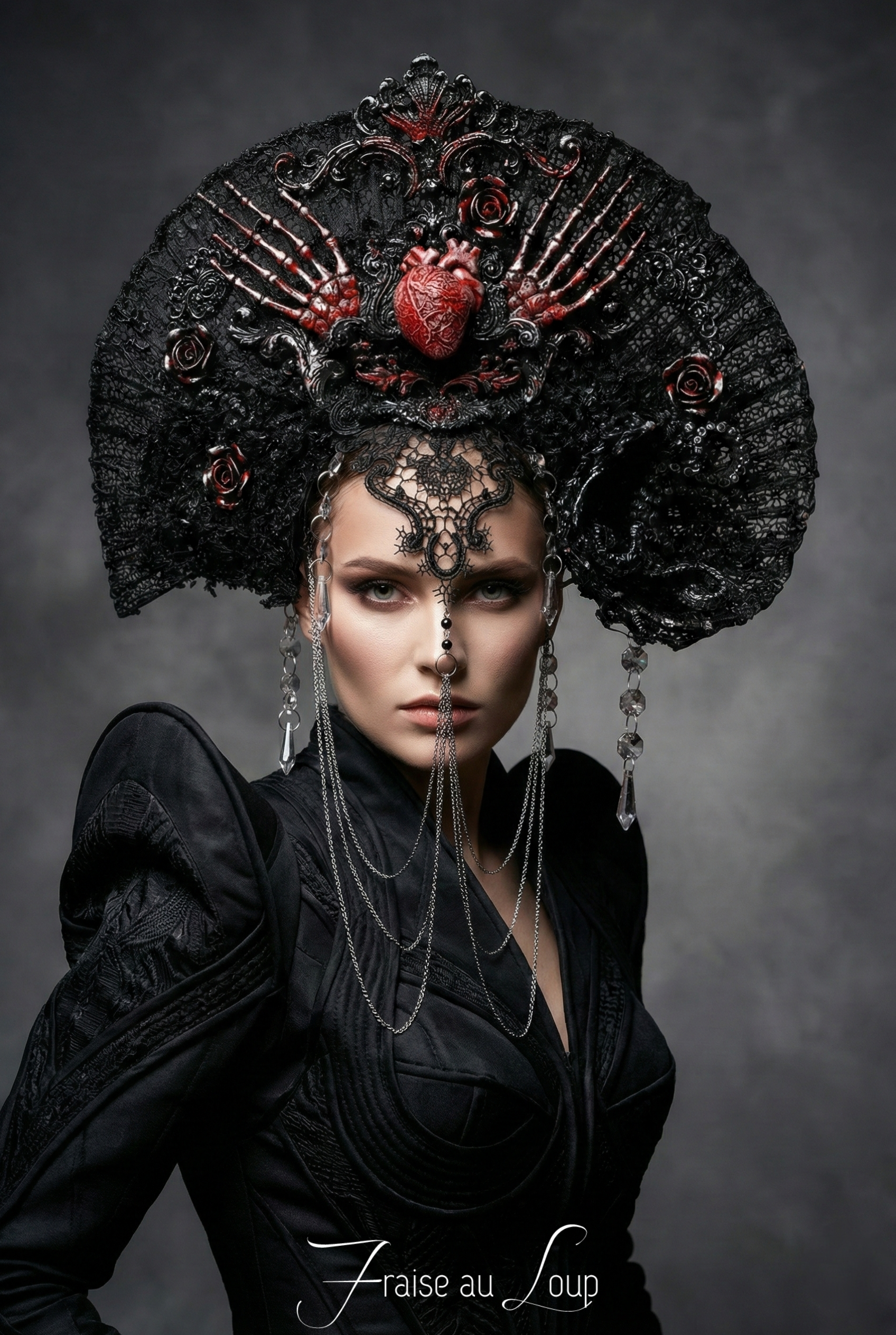 Coiffe Halo Dragon Gothique Cosplay Fantasy Avant Garde Burning Man dark. Coeur. Squelette. Bijoux. Création unique prête à expédier